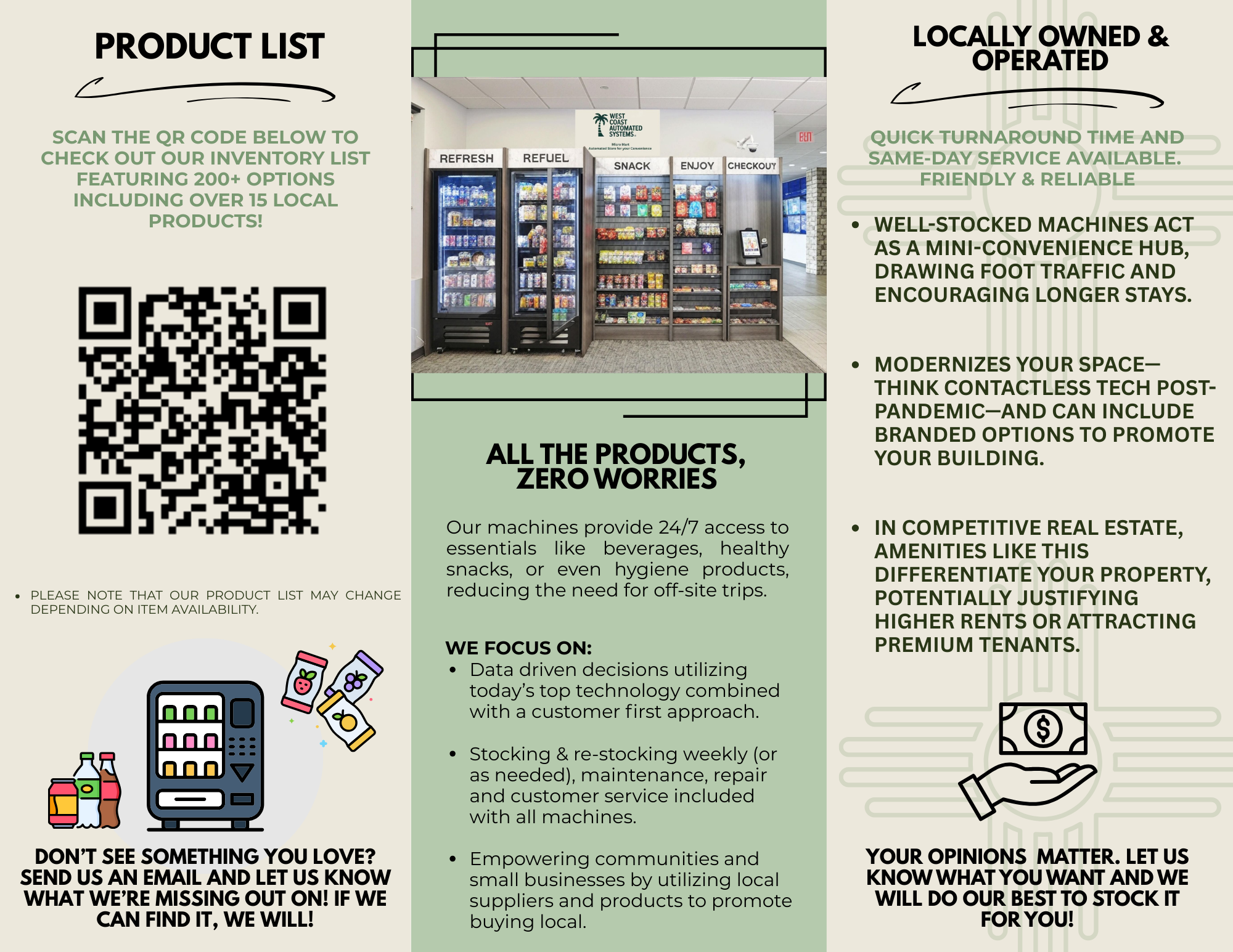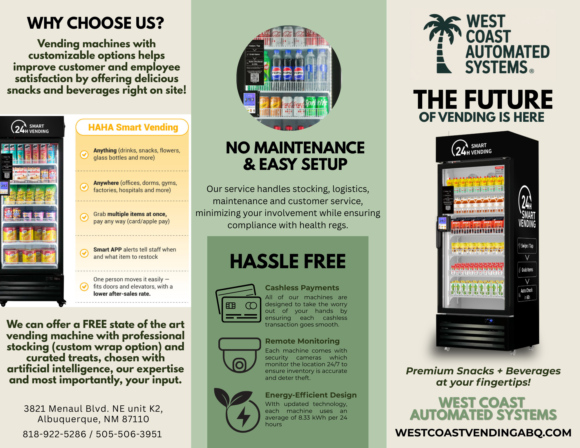 Locally owned and operated in right here in Albuquerque, NM, our knowledge and support of the local community in second to none. We strive to offer unparalleled service and products to you and everyone else at an affordable price in any convenient location. In a world of cookie-cutter vending, West Coast Automated Systems redefines refreshment with our newly developed technology, automated AI interface, and local partnerships with great companies. Our sleek machines don’t just dispense snacks; they learn your neighborhood. Using real-time foot-traffic analytics and community taste profiles, each unit curates fresh, locally-sourced inventory for everyone in the building to enjoy!