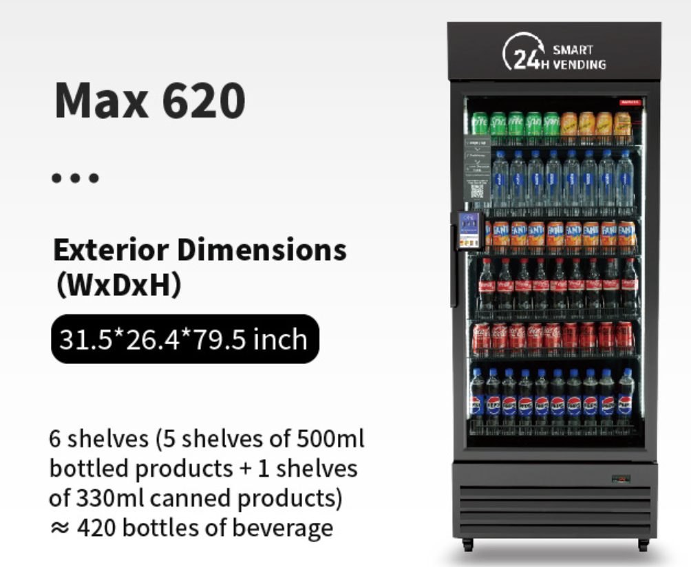 Same as the Max 620, the Max 620S has more storage for your product selection along with an HD LED screen above to take your machine to the next level. Advertise your brand or anything else!